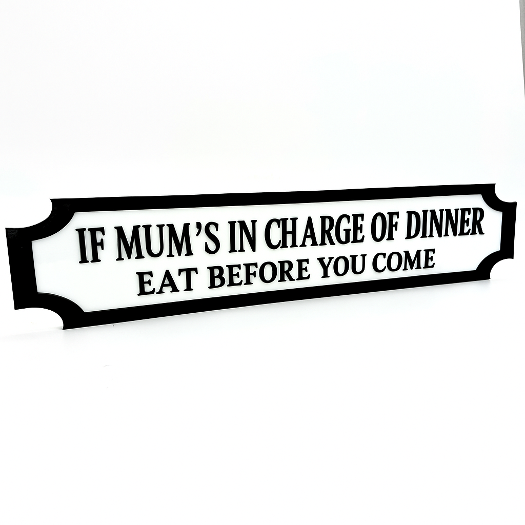 Bring laughter to the heart of the home with our bestselling 3D acrylic street signs. This “If Mum’s in Charge of Dinner – Eat Before You Come” design is the perfect cheeky addition to any kitchen or dining room, especially in households where Mum’s cooking skills are… memorable.