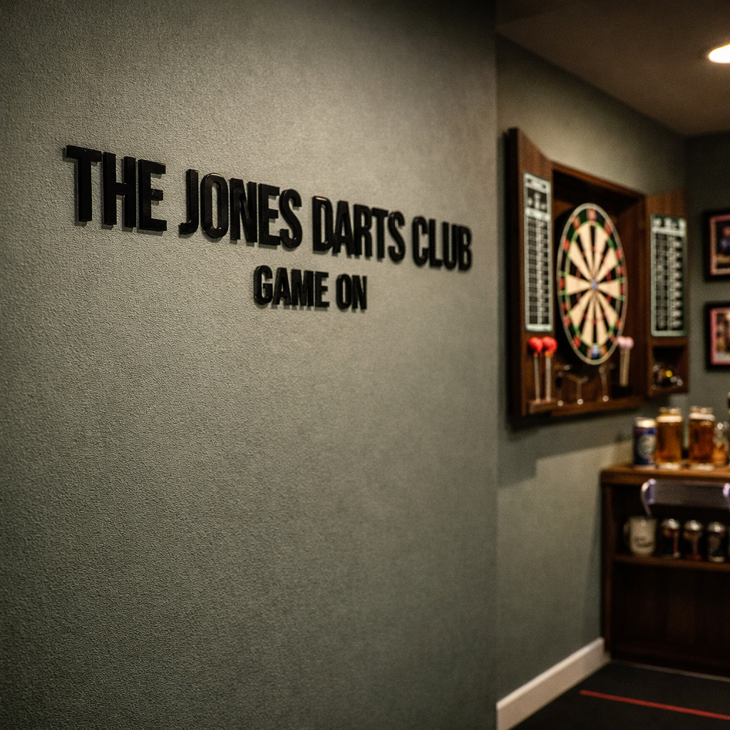 Create the ultimate darts room feature wall with a premium 3D acrylic wall sign — the perfect statement piece for home darts rooms, darts lounges, man caves and games rooms. Precision laser-cut and hand-finished in our UK workshop, each sign features bold raised lettering with your chosen room name, title or slogan.