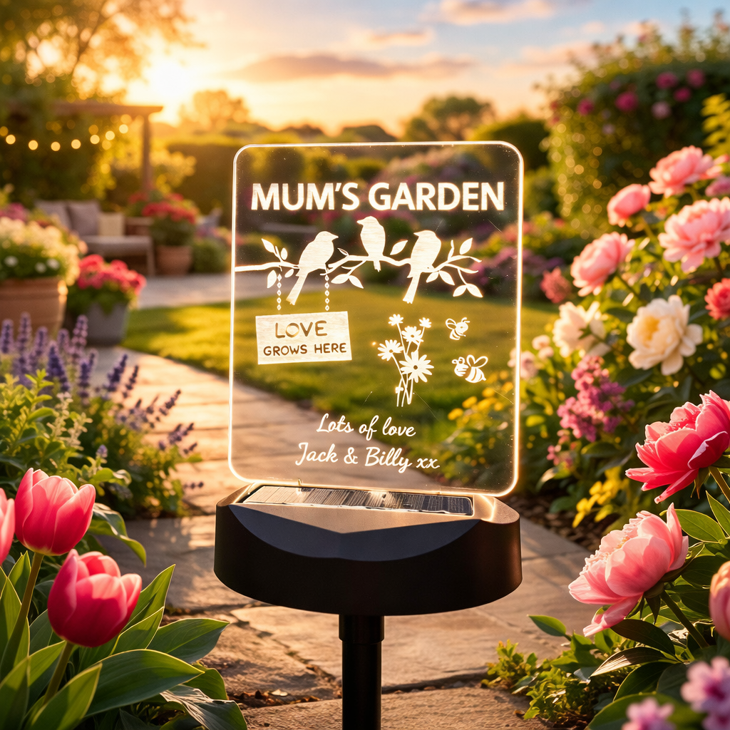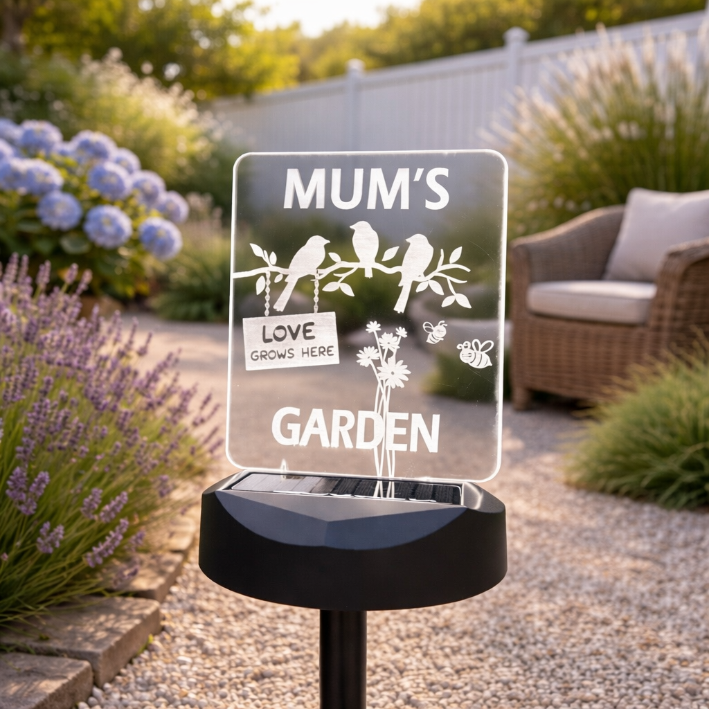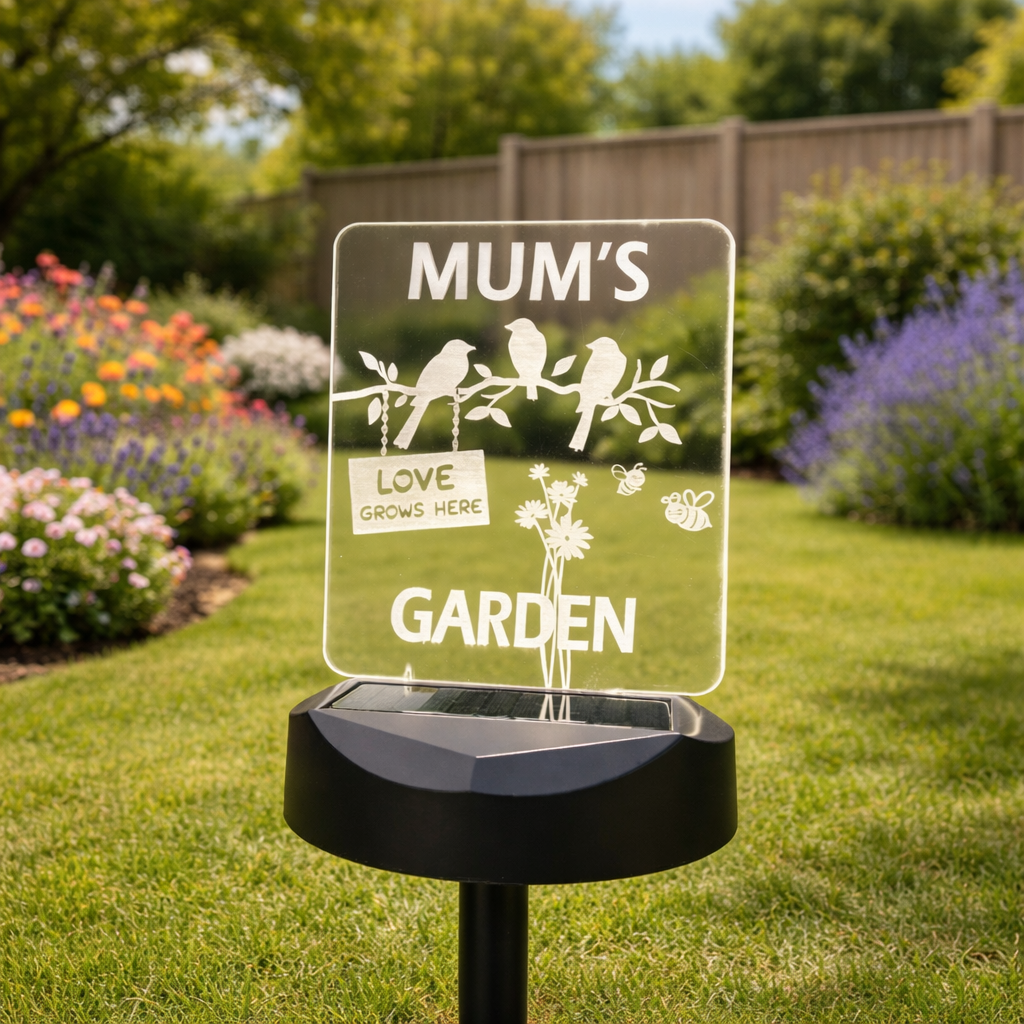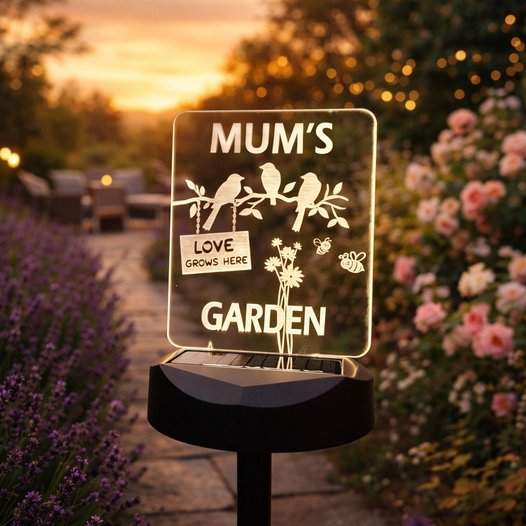 A beautifully illuminated personalised solar garden sign designed to celebrate the heart of every home – Mum’s garden.